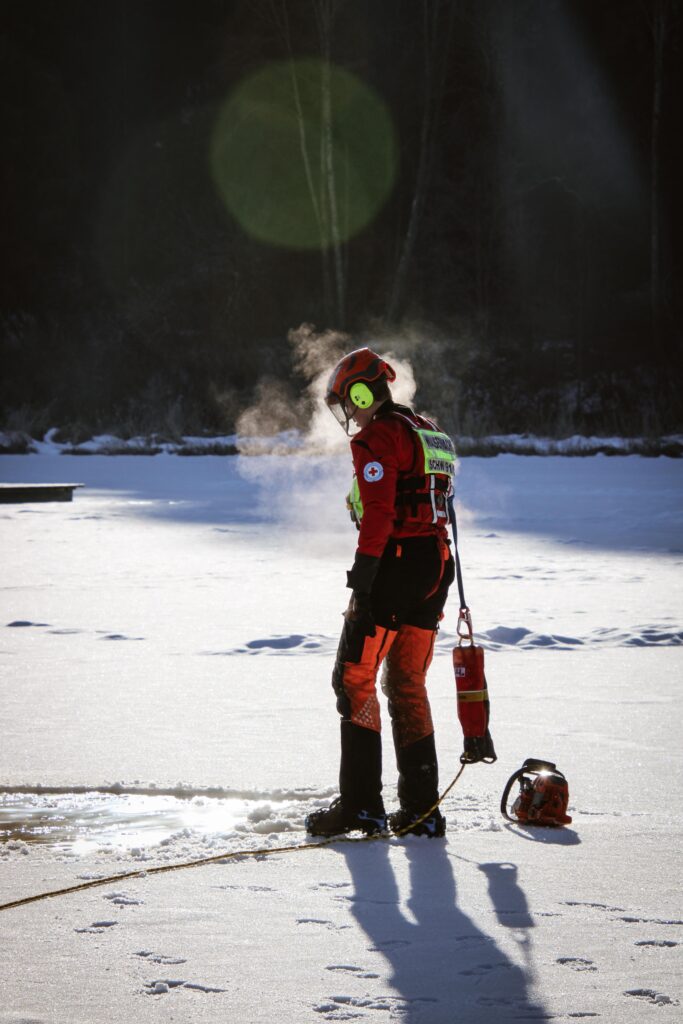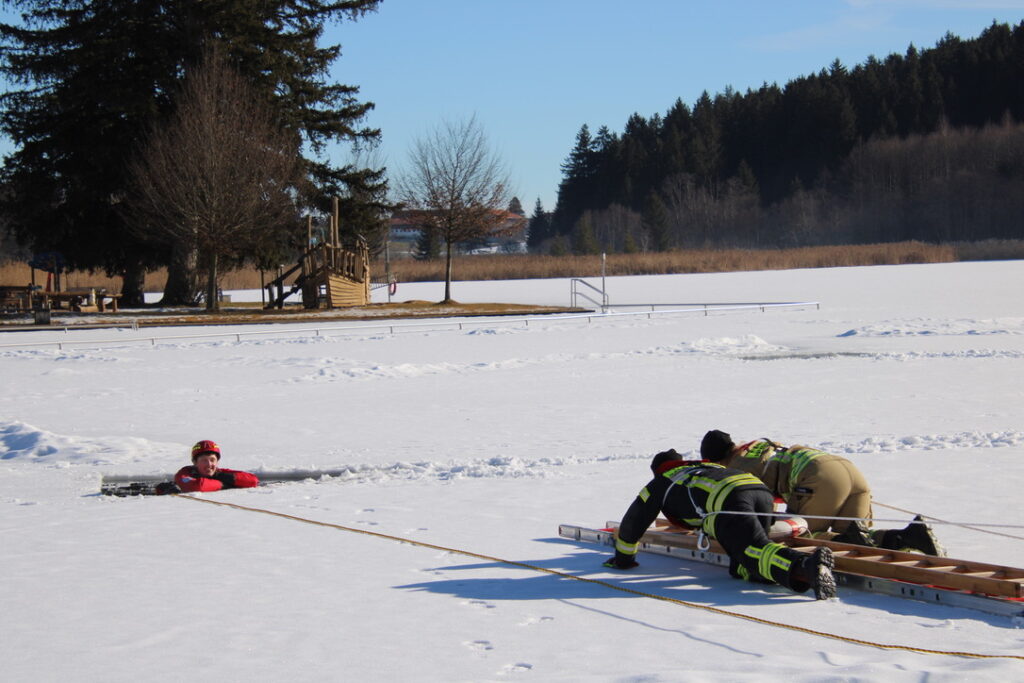 Hierbei wurde die Gunst der Stunde genutzt, um unter den gegebenen Bedingungen das Retten einer im Eis eingebrochenen Person zu üben.